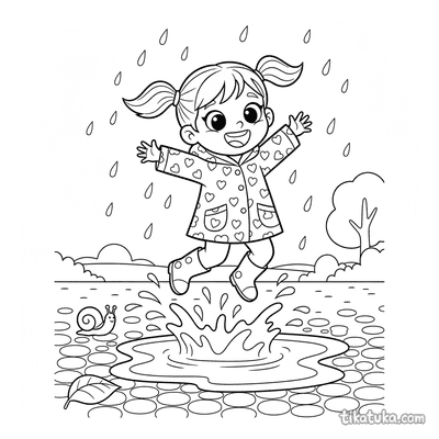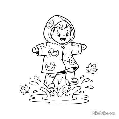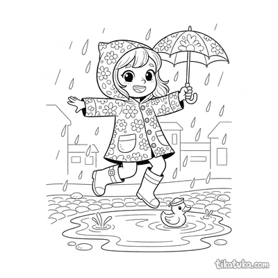 Os desenhos mostram crianças com capas de chuva a saltar sobre poças de outono e primavera, patinhos a seguir a mãe pela água e até um stegossauro a brincar em poças de maré. Cada página apresenta contornos nítidos em preto e branco, ideais para colorir. Pode descarregar e imprimir qualquer uma das 11 páginas de forma gratuita, ou colori-las diretamente no ecrã do seu dispositivo.