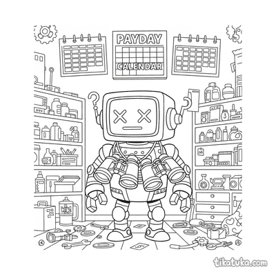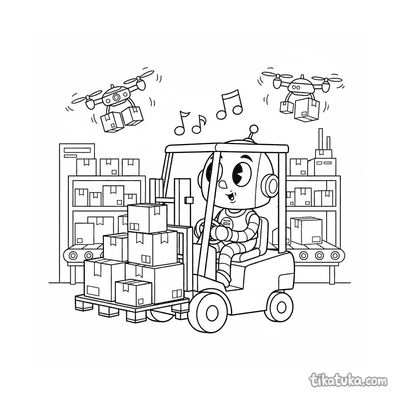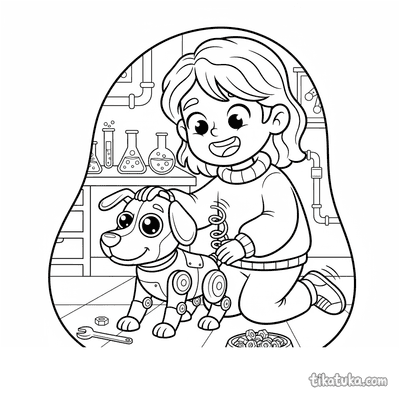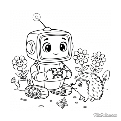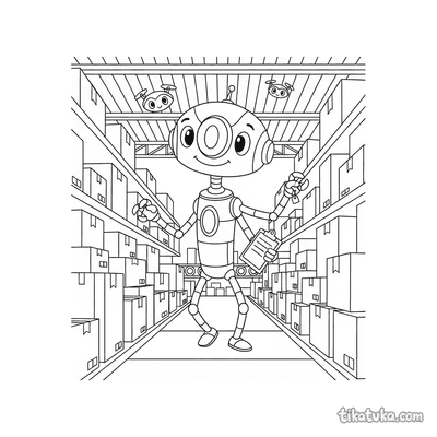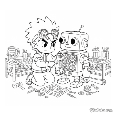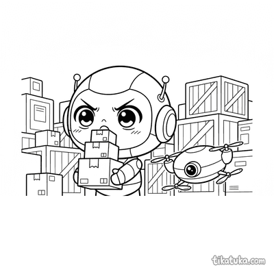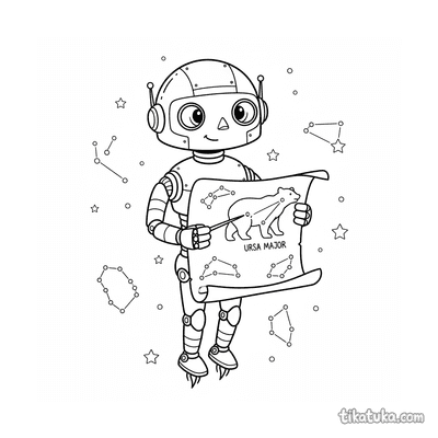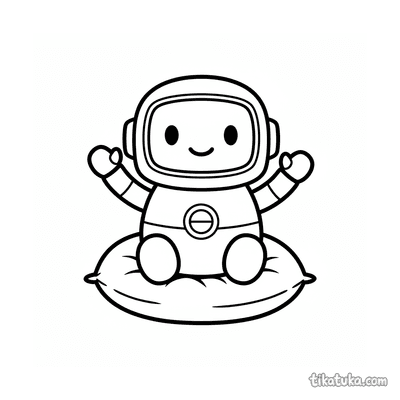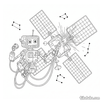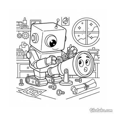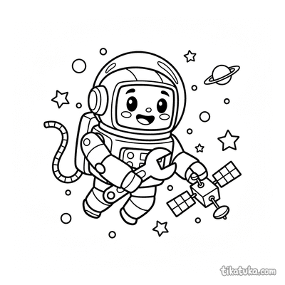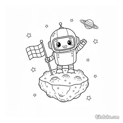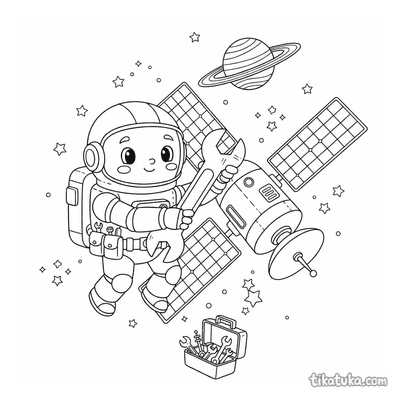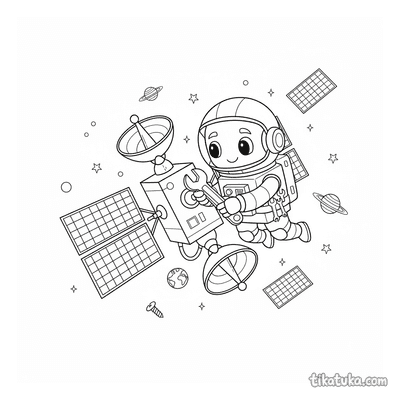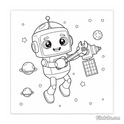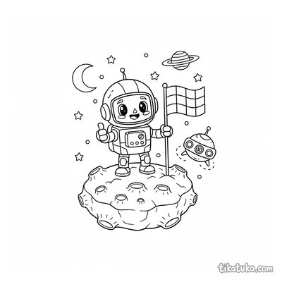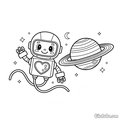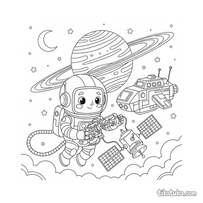 As páginas incluem robôs astronautas explorando planetas anelados, consertando satélites em órbita, flutuando no espaço com peixes espaciais ou caminhando na Lua. Também há cenas em ferro-velhos espaciais e interações com outros personagens, como uma menina astronauta.