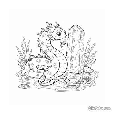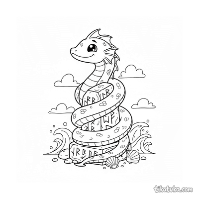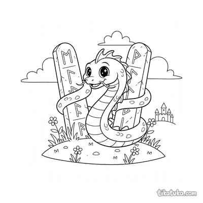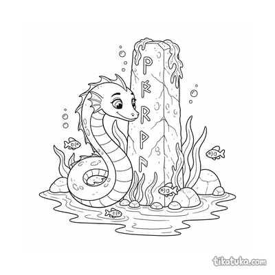Aqui você encontra a serpente marinha enrolada em pedras rúnicas submersas, enroscada em monólitos antigos ou descansando sobre lajes. Algumas cenas mostram a serpente guardiã de menires, outras a retratam de forma brincalhona entre os pilares. Todos os desenhos estão em preto e branco, com traços limpos que facilitam o preenchimento. Você pode baixar e imprimir qualquer página individualmente ou todas de uma vez para horas de diversão criativa.