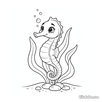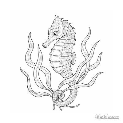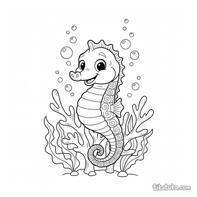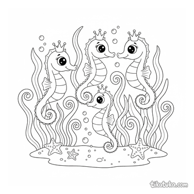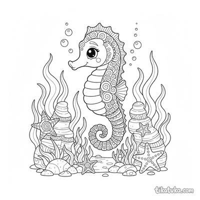 As crianças podem colorir cenas de cavalos-marinhos enrolados em corais, nadando entre florestas de algas ou interagindo com personagens como o papagaio-do-mar carteiro. Há também imagens de exploradores submarinos a vapor descobrindo este mundo subaquático. Todos os 21 desenhos estão em preto e branco, com traços nítidos ideais para imprimir em casa ou na escola. É fácil baixar as páginas em lote para ter uma atividade completa sobre a vida marinha.