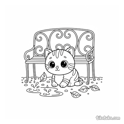 Gatinho se abrigando sob banco de jardim na chuva