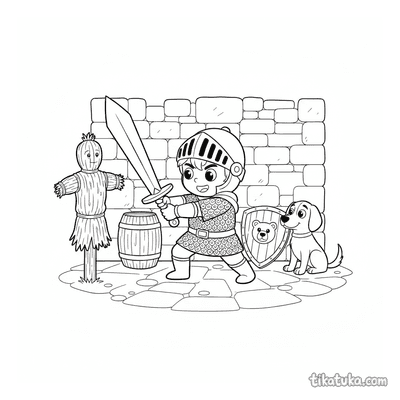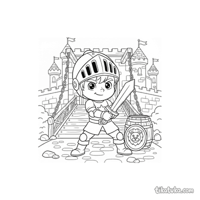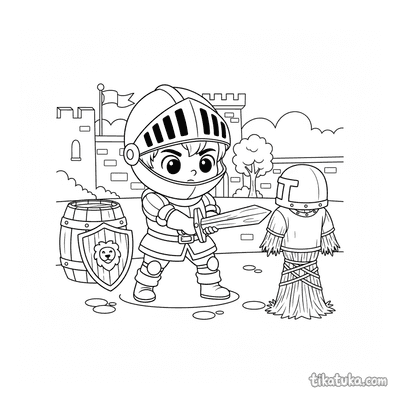 Nestas páginas, você encontrará jovens cavaleiros com seus escudos em treinamento, praticando esgrima ou parados em pontes levadiças e portões de castelos. O escudo é um elemento central em cada cena de aventura. Todas as ilustrações estão em preto e branco, com traços bem definidos que são ideais para impressão. Você pode baixar os desenhos individualmente ou imprimir vários de uma vez para uma tarde inteira de diversão criativa.