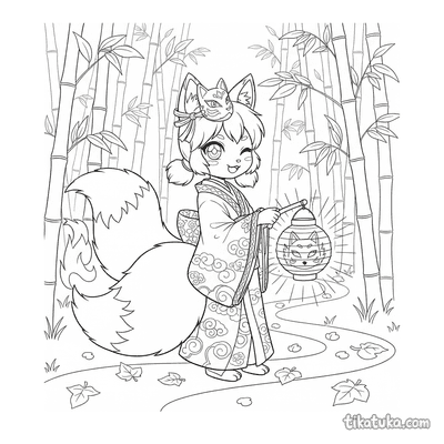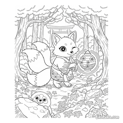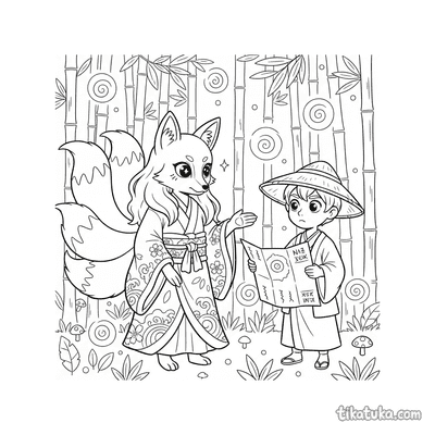 Encontre aqui cenas do espírito Kitsune com sua lanterna, recolhendo folhas de outono ou guiando viajantes pela floresta de bambu. Há também o espírito do vento celebrando em um salão do labirinto ou oferecendo ajuda no templo da montanha, além de outras criaturas como o duende das nuvens e o marinheiro perdido. Todas as ilustrações estão em preto e branco, com traços limpos que são ideais para as crianças preencherem com cores. Você pode baixar e imprimir várias páginas de uma vez para criar uma sessão de colorir completa sobre estas histórias de espíritos.