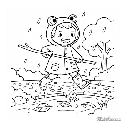 Criança de capa de chuva pulando sobre riacho com graveto