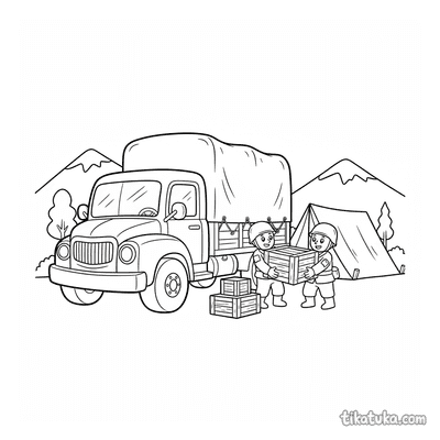 Caminhão de Suprimentos Descarregando Caixas no Acampamento