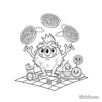 Monstro espinhoso malabarizando com tortinhas de fruta