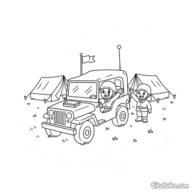 Nesta secção, encontrará cenas que incluem barracas de campanha, tendas de rádio e quartéis-generais de campo. Os desenhos apresentam veículos como jipes, caminhões do exército e ambulâncias estacionados perto das barracas, além de soldados, comandantes e figuras kawaii interagindo com estes abrigos. Pode baixar e imprimir qualquer um dos 14 desenhos individualmente ou em conjunto para uma atividade em grupo. As linhas bem definidas de cada ilustração são ideais para colorir com lápis ou marcadores, e também pode experimentar colorir as cenas diretamente no nosso site.