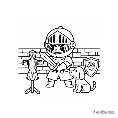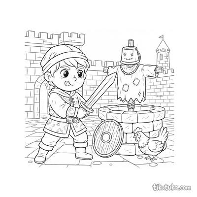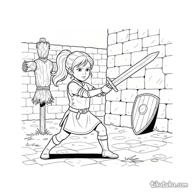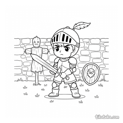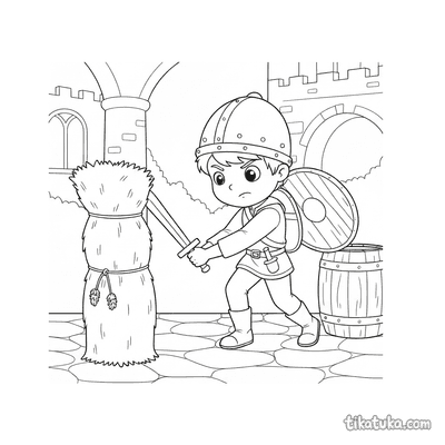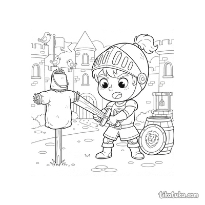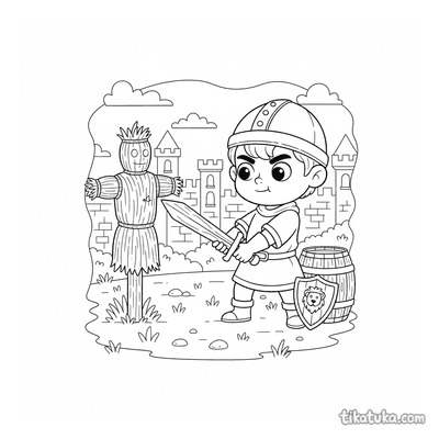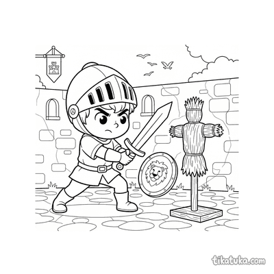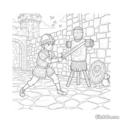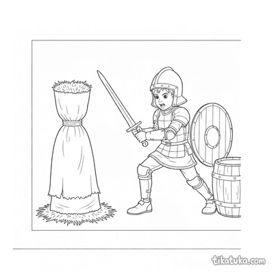 Os desenhos focam em cenas específicas de preparação, como um jovem cavaleiro praticando esgrima no pátio de um castelo ou treinando com uma espada de madeira contra um boneco de palha. Você encontrará várias poses de prática, desde o manejo básico da arma até exercícios mais elaborados contra espantalhos. Todas as ilustrações estão em preto e branco, com traços bem definidos que facilitam o preenchimento com lápis de cor. Você pode baixar e imprimir quantas cópias quiser para criar sua própria coleção de cenas de treinamento medieval.