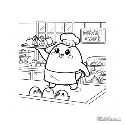 Você encontrará cenas com um chef Mochi equilibrando uma fruta, apresentando uma bandeja de guloseimas ou entregando uma bebida. Há também um desfile de Mochi na bandeja, uma menina servindo cupcakes e um robô de madeira servindo chá na varanda. Os desenhos em preto e branco têm traços nítidos, ideais para imprimir em lote para uma turma ou para colorir diretamente no site. Cada página oferece uma visão diferente e divertida do uso de uma bandeja, perfeita para horas de atividade criativa.