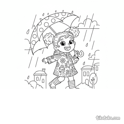 As páginas para colorir mostram crianças usando guarda-chuva e capas de chuva, muitas vezes pulando em poças d'água. Você encontrará meninas segurando guarda-chuvas coloridos, como o de arco-íris, em meio a dias chuvosos. Todas as ilustrações estão em preto e branco, com traços claros ideais para colorir. Você pode baixar e imprimir os 63 desenhos de uma vez para ter uma atividade completa sobre esse tema.