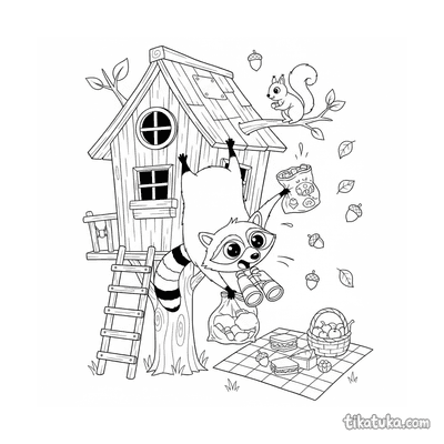 Guaxinim caótico na casa na árvore