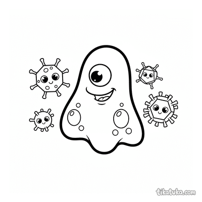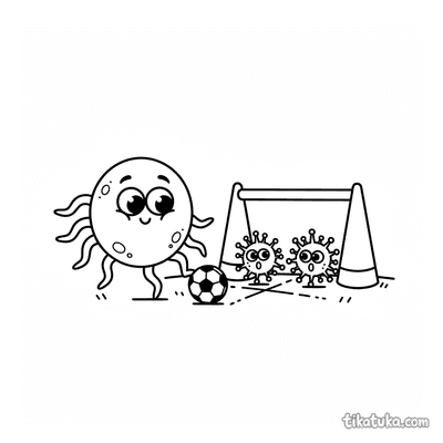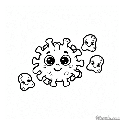 Aqui você encontra vírus dançantes com proteínas de espinho, bactériofagos aterrissando em bactérias e vírus carteiros. Há também cenas de brincadeira, como bactérias jogando cabo de guerra ou futebol com um vírus, e micróbios andando de patinete. Todas as páginas têm contornos nítidos em preto e branco, perfeitos para colorir com lápis ou giz de cera. Você pode baixar e imprimir qualquer desenho gratuitamente, em casa ou na escola, para ter horas de diversão criativa.
