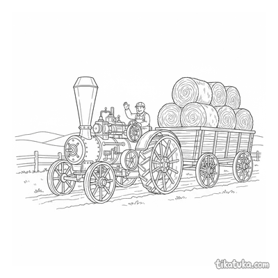 Trator a Vapor Antigo Puxando uma Carroça de Feno