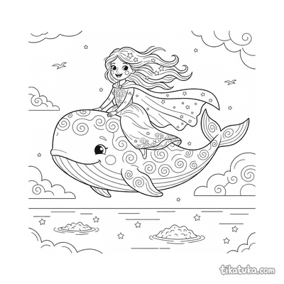 As crianças podem colorir baleias cósmicas nadando por campos de asteroides, baleias celestes voando sobre palácios ou filhotes brincando com peixes-estrela nas nuvens. Há também princesas montando baleias de nuvens e criaturas bioluminescentes em viagens espaciais, oferecendo uma grande variedade de cenas detalhadas. Todos os 19 desenhos estão prontos para serem impressos em preto e branco, com traços bem definidos ideais para lápis de cor e giz de cera. É fácil baixar várias páginas de uma vez para criar uma sessão de pintura temática ou usar a ferramenta de colorir online diretamente no site.