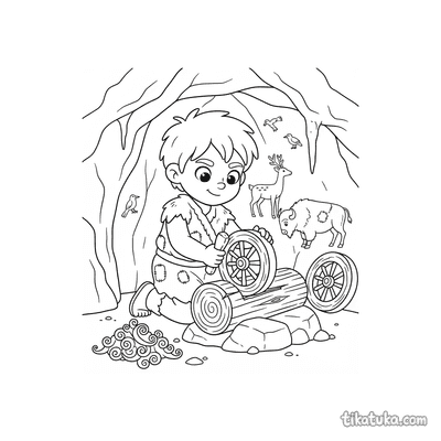Menino Inventor da Idade da Pedra Talhando uma Roda