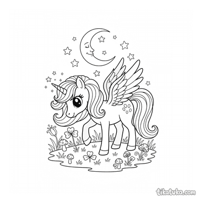 As páginas para colorir incluem cenas de pôneis mágicos com asas emplumadas a pastar ao luar, unicórnios alados em prados encantados e criaturas como o Pégaso a saltar sobre as nuvens. Cada desenho oferece contornos nítidos em preto e branco, ideais para as crianças explorarem a sua criatividade. Pode baixar e imprimir qualquer uma das ilustrações gratuitamente, ou colorir online, para horas de diversão artística focada no tema das asas.