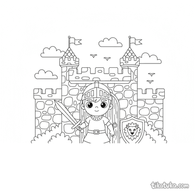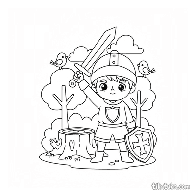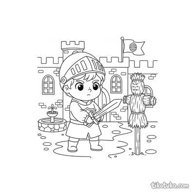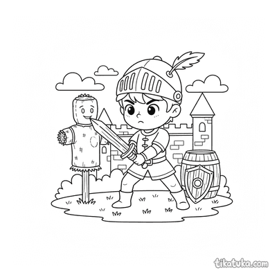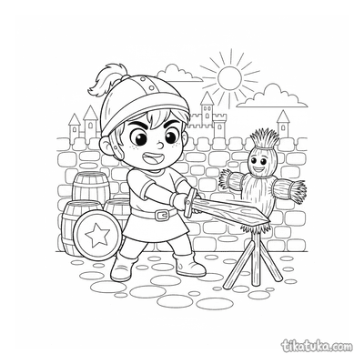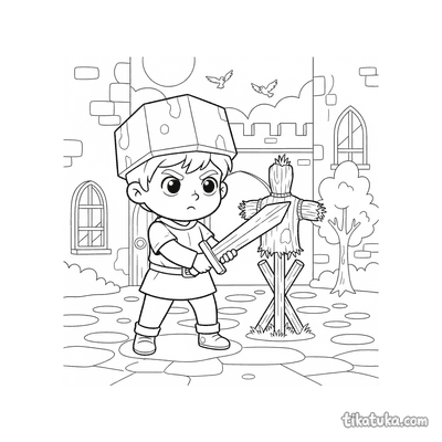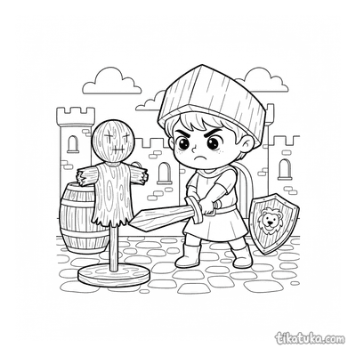 Esta coleção apresenta desenhos para colorir focados na espada de madeira. As ilustrações retratam cenas de treino e aventura com este objeto clássico. As imagens mostram jovens cavaleiros em momentos de prática e aprendizado.