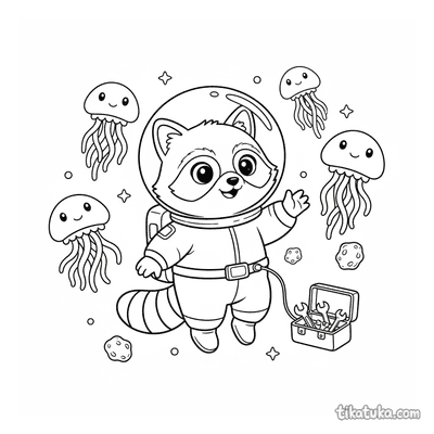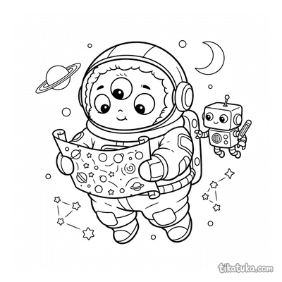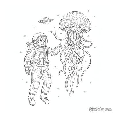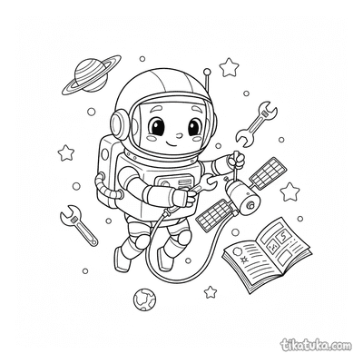 Estas páginas para colorir sobre gravidade-zero mostram um robô astronauta, um menino com uma água-viva espacial e o guaxinim Shmyak em aventuras. As cenas incluem astronautas consertando satélites e personagens flutuando no espaço. Você pode baixar e imprimir todas as 17 páginas de uma vez para criar um caderno de atividades. Os contornos em preto e branco são nítidos, ideais para colorir com lápis ou online.